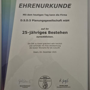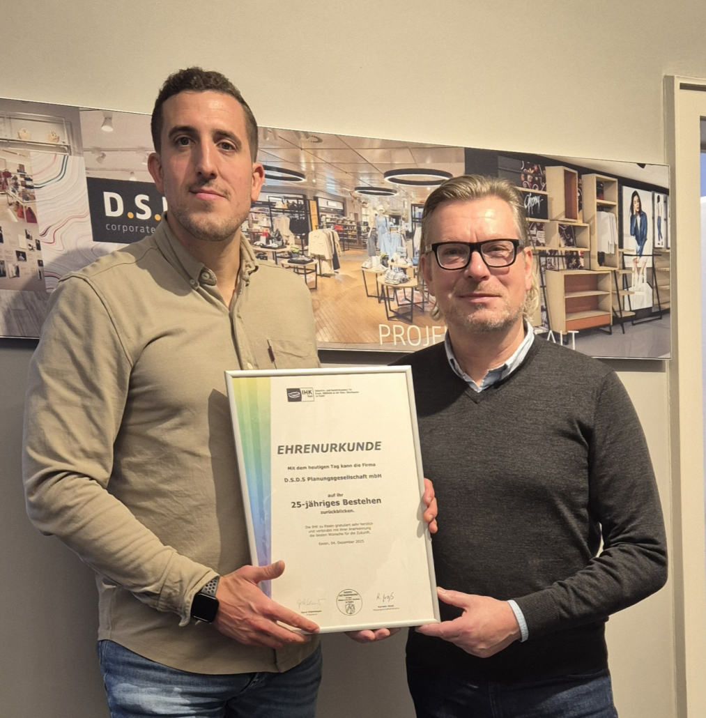 Wir danken der IHK zu Essen für die Glückwünsche und die Ehrung sowie allen Kolleginnen und Kollegen, Partnern und Auftraggebern, die uns in den vergangenen 25 Jahren begleitet haben. Mit großer Motivation blicken wir nach vorn – auf spannende Projekte, neue Ideen und die nächsten 25 Jahre D.S.D.5 Department Store Design.