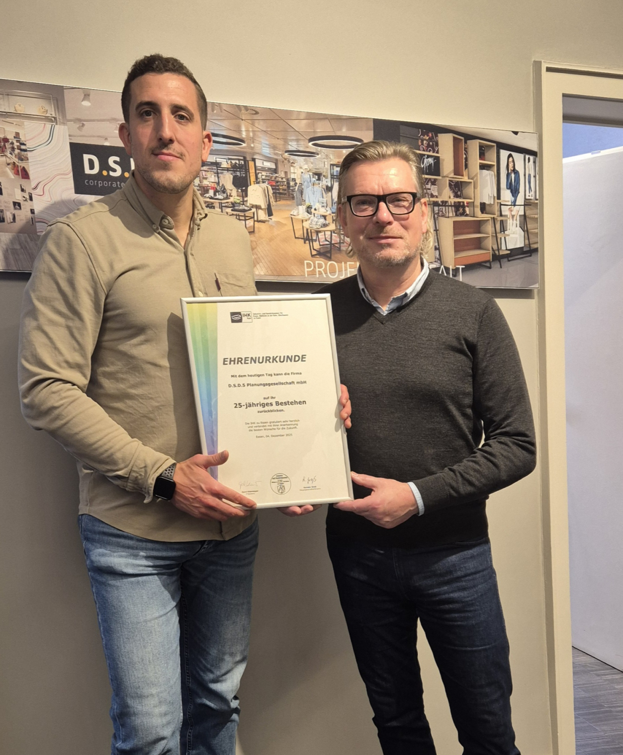 Wir danken der IHK zu Essen für die Glückwünsche und die Ehrung sowie allen Kolleginnen und Kollegen, Partnern und Auftraggebern, die uns in den vergangenen 25 Jahren begleitet haben. Mit großer Motivation blicken wir nach vorn – auf spannende Projekte, neue Ideen und die nächsten 25 Jahre D.S.D.5 Department Store Design.